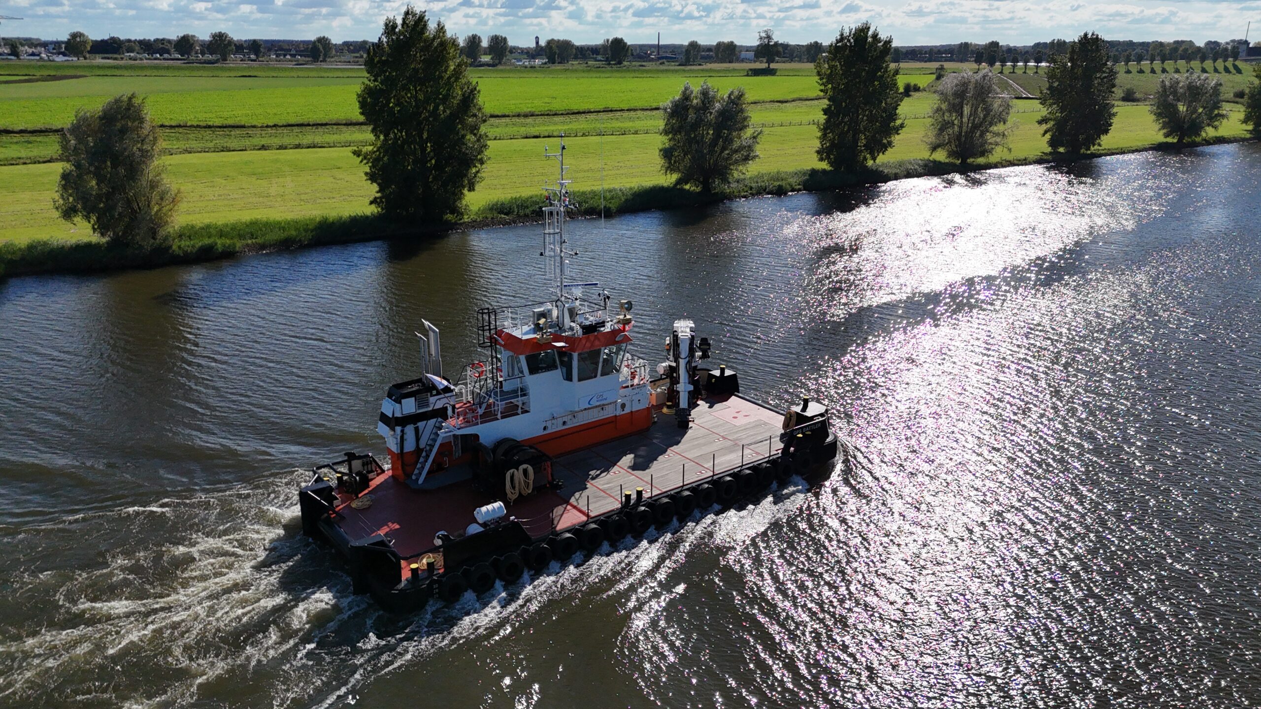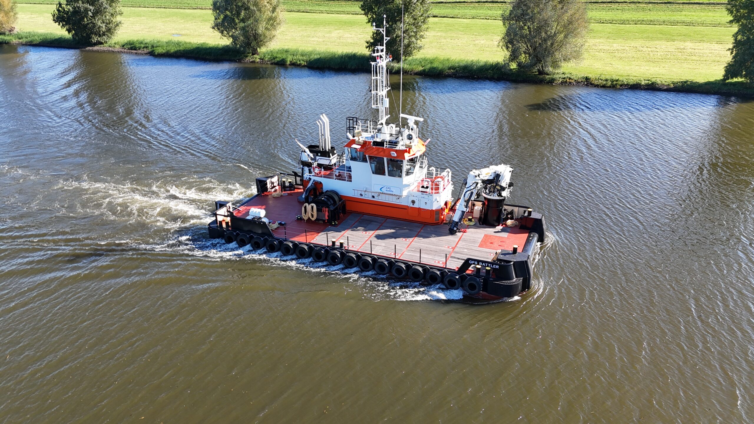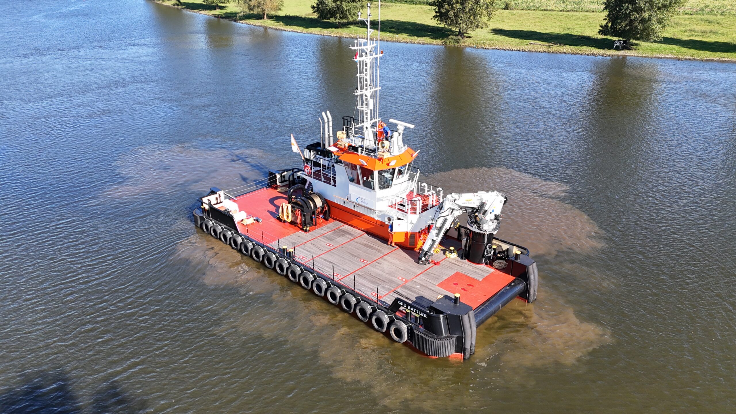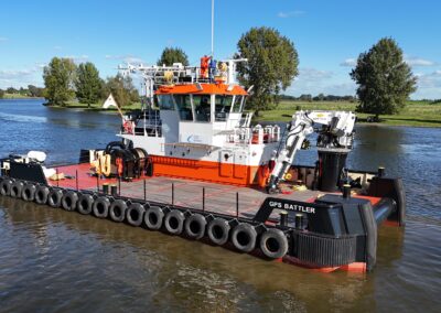 The “GPS BATTLER”, built in 2024, is a shallow draft multipurpose workboat of 24,45 by 9,54 meters.