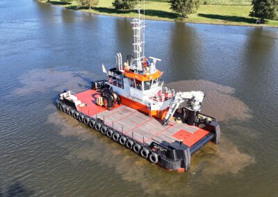 The twin Volvo engines delivering 1.798 BHP which results in 23,2 tons bollard pull. In combination minimal draft, the bow thruster and twin fixed propellers in nozzles, gives the vessel maximum maneuverability.