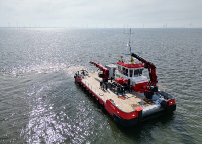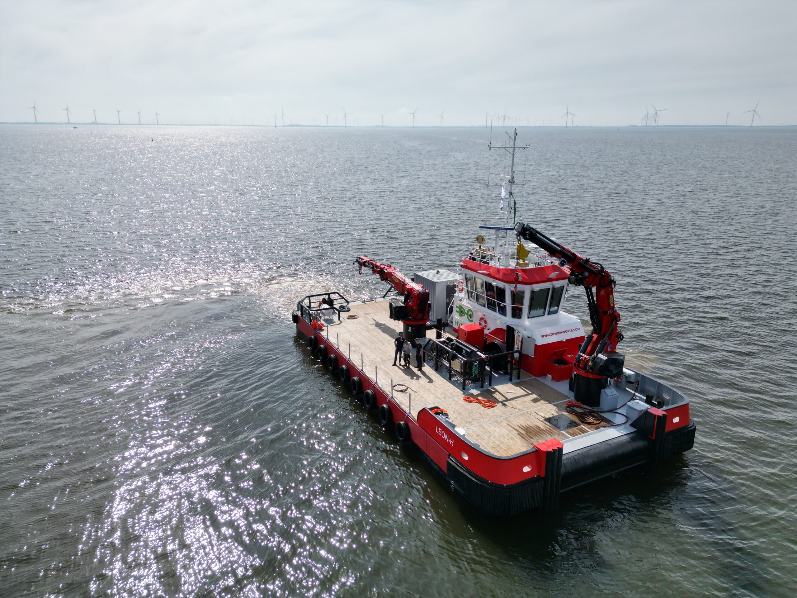 The “LEON-H”, built in 2024, is a Hybridcat WERFT2411e and ultra shallow draft multipurpose workboat of 23,95 by 11,46 meters.