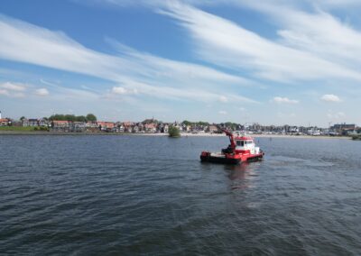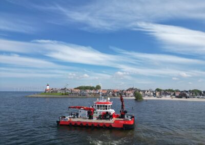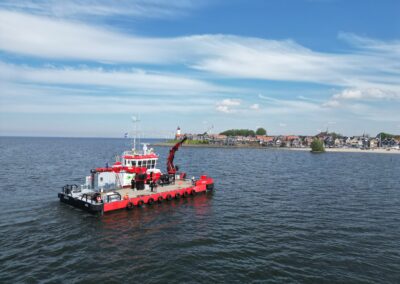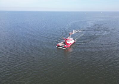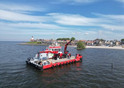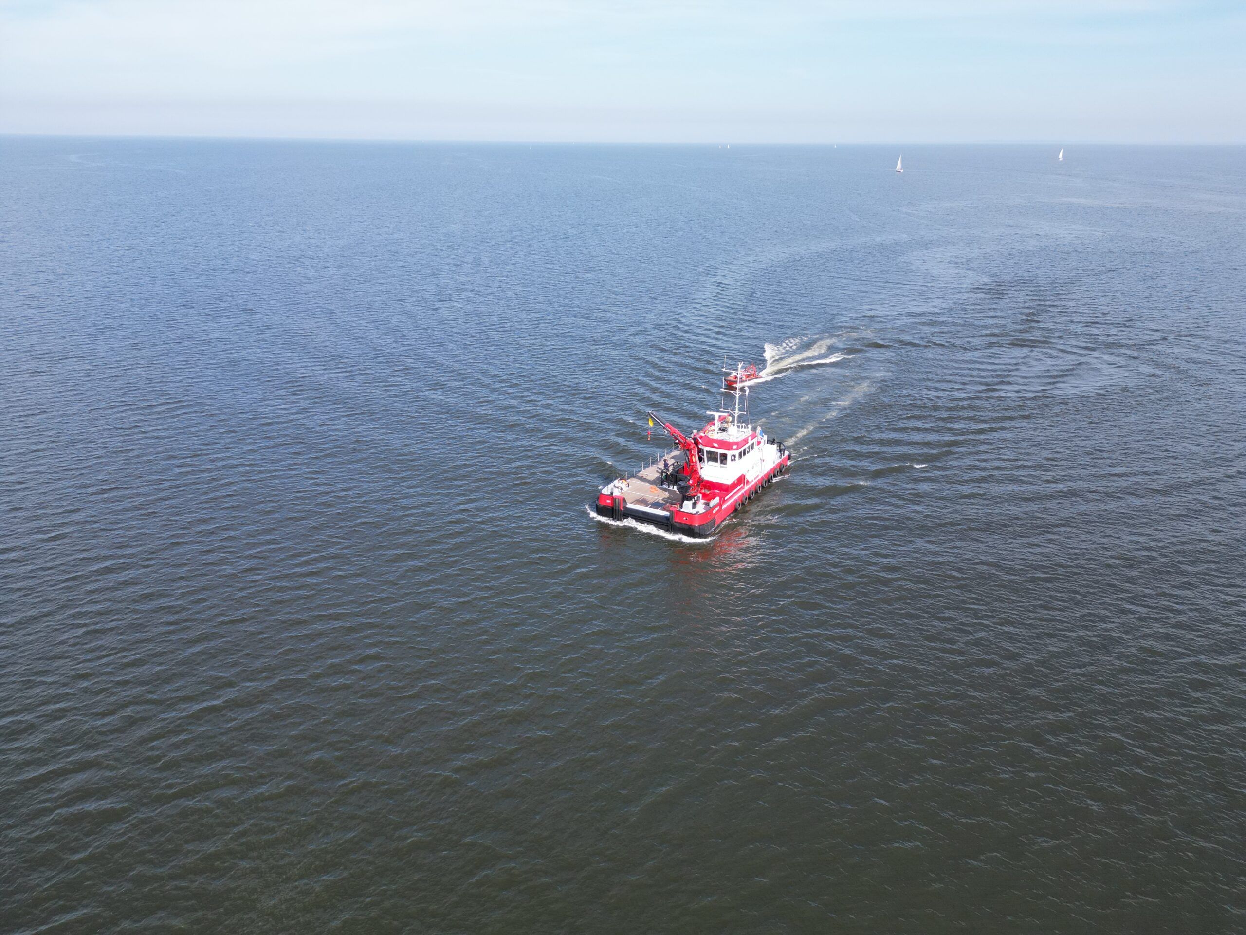 The twin Scania engines delivering 930 kW supported by two electric driven e-motors of 450 kW, which results in 15,0 tons bollard pull. In combination with the minimal draft of 1,00-1,50 meters, the Hydraulically driven 200 BHP bow thruster and double fixed pitch propellers in nozzles, gives the vessel maximum maneuverability.